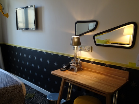 飯店對於細節絲毫不馬虎, 巴黎鐵塔造型的檯燈讓房間更有巴黎的氣氛, 床頭除了有檯燈, 還掛上以凱旋門為主題的抽象畫, 甚至還附收音機
